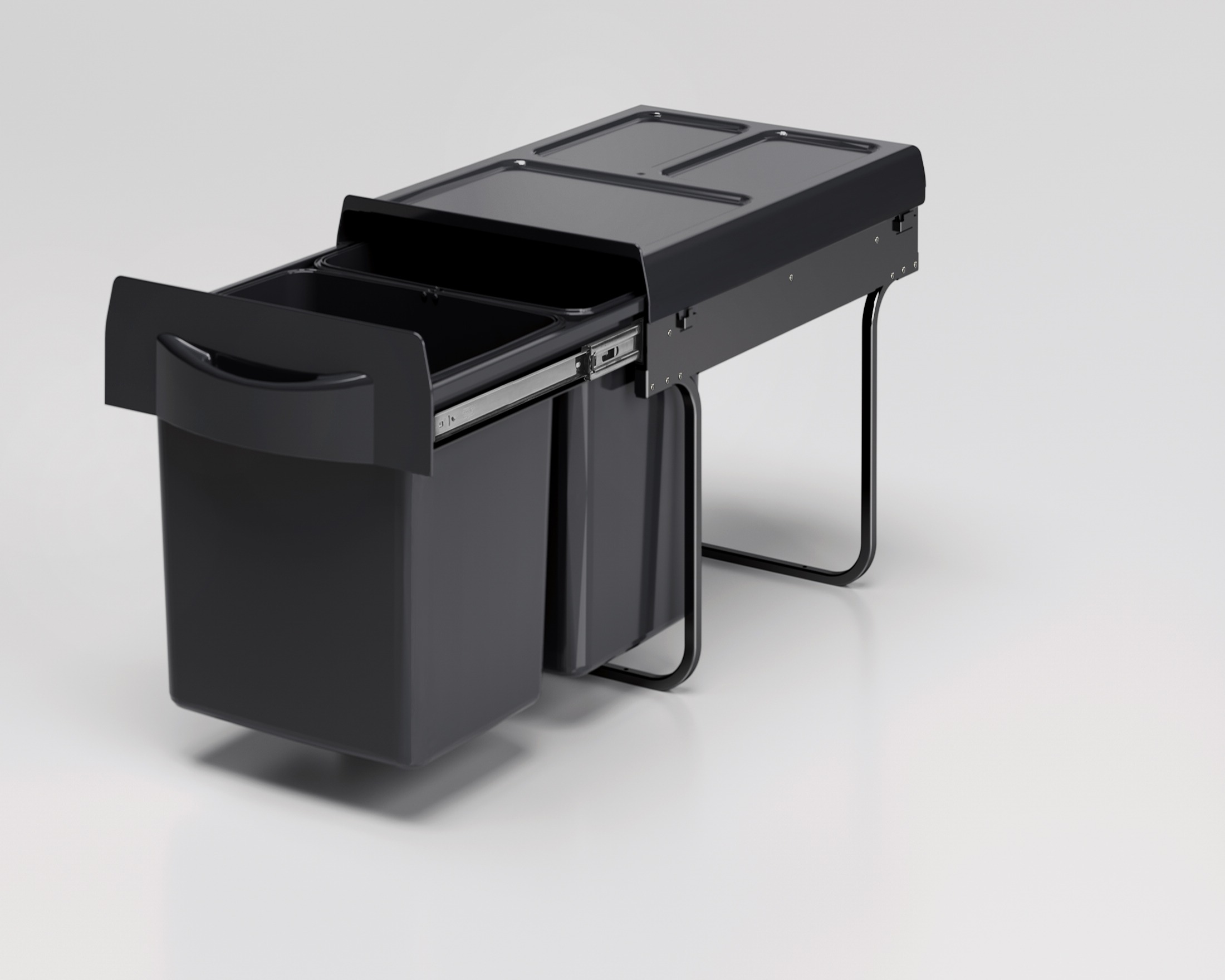 Sistema di separazione dei rifiuti da incasso con staffe da fissare alla base del mobile per una facile e veloce installazione e disinstallazione. Chiusura soft-closing. Coperchio contenitore in materiale plastico per bloccare gli odori. Cassetto e secchi interamente estraibili. Dimensioni: 341x510x