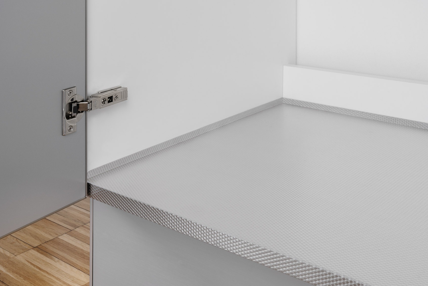 Protezione piatta in alluminio rombato stampato, con angoli piegati e chiusi. Per fianchi mobile con spessore 18 mm.
