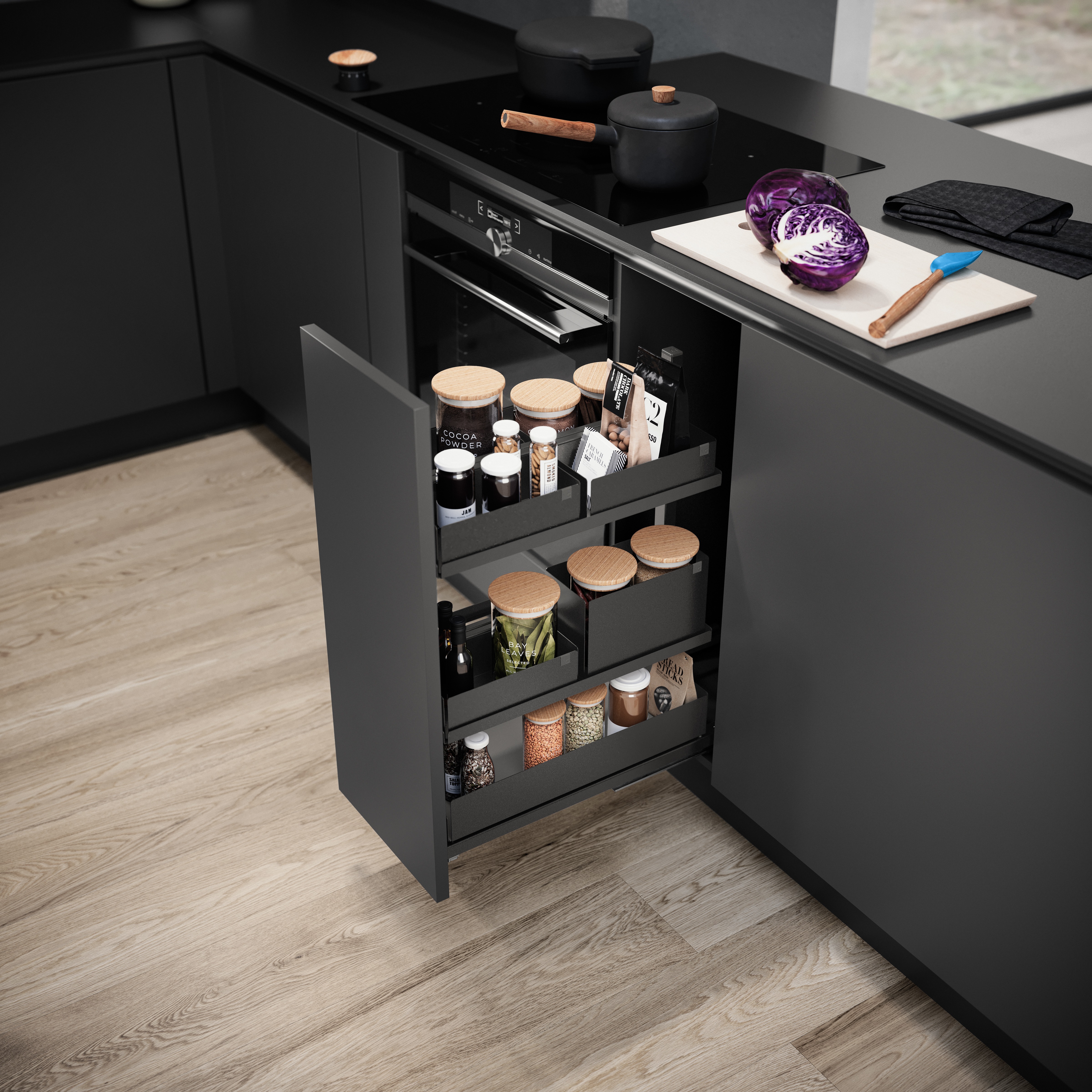 Questa soluzione per colonna apre le migliori prospettive in cucina. L'elemento estraibile è talmente innovativo da stabilire nuovi standard in fatto di comfort e design. Si contraddistingue soprattutto per il meccanismo di apertura, che in un solo movimento consente di avere tutto sott'occhio e a