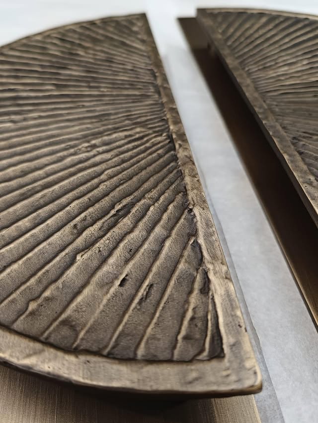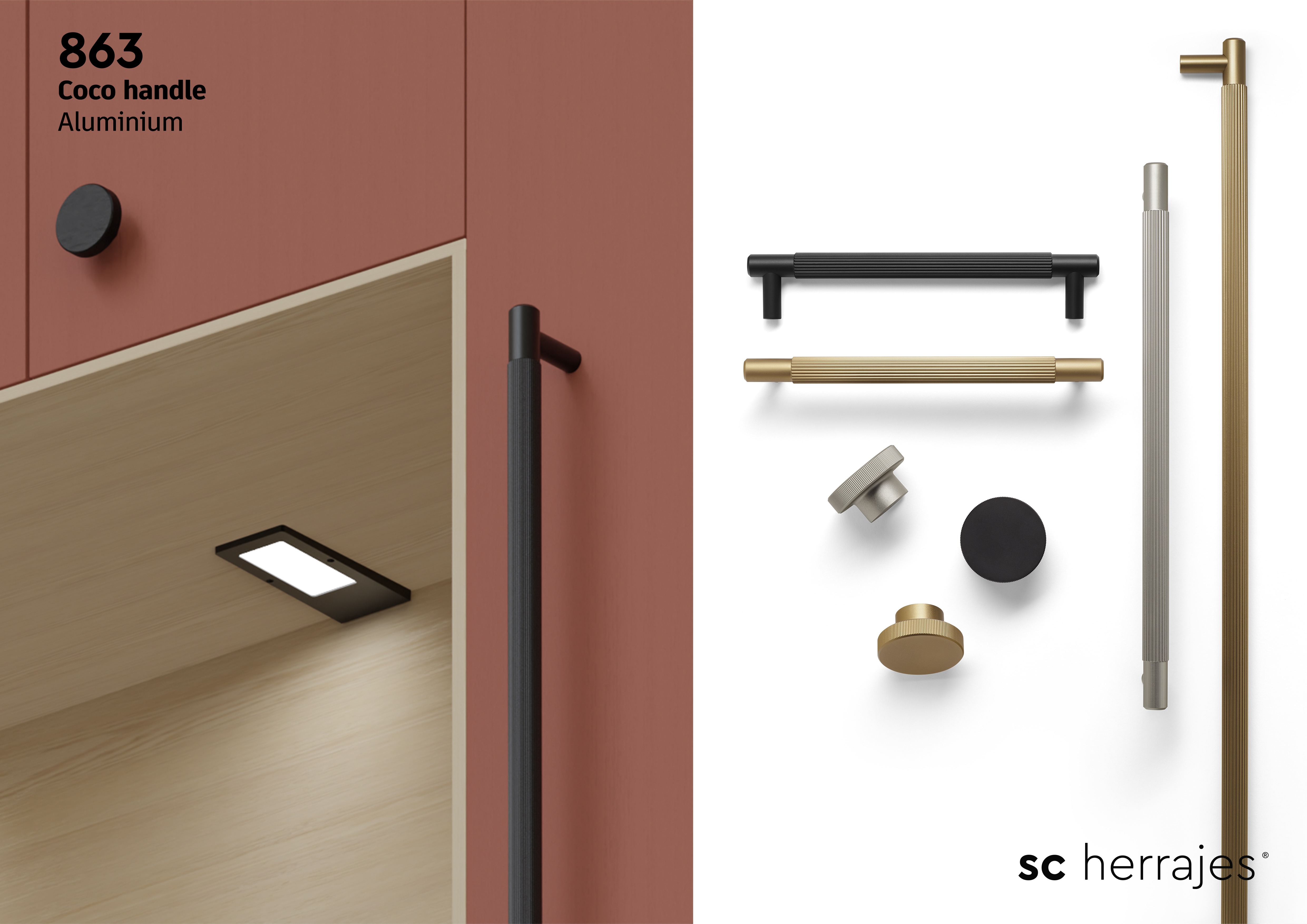 Solidity and elegance. The accurate composition of a cylinder with a half cylinder generates a strong and elegant handle whose front surface lends itself to accommodating different kinds of processing.