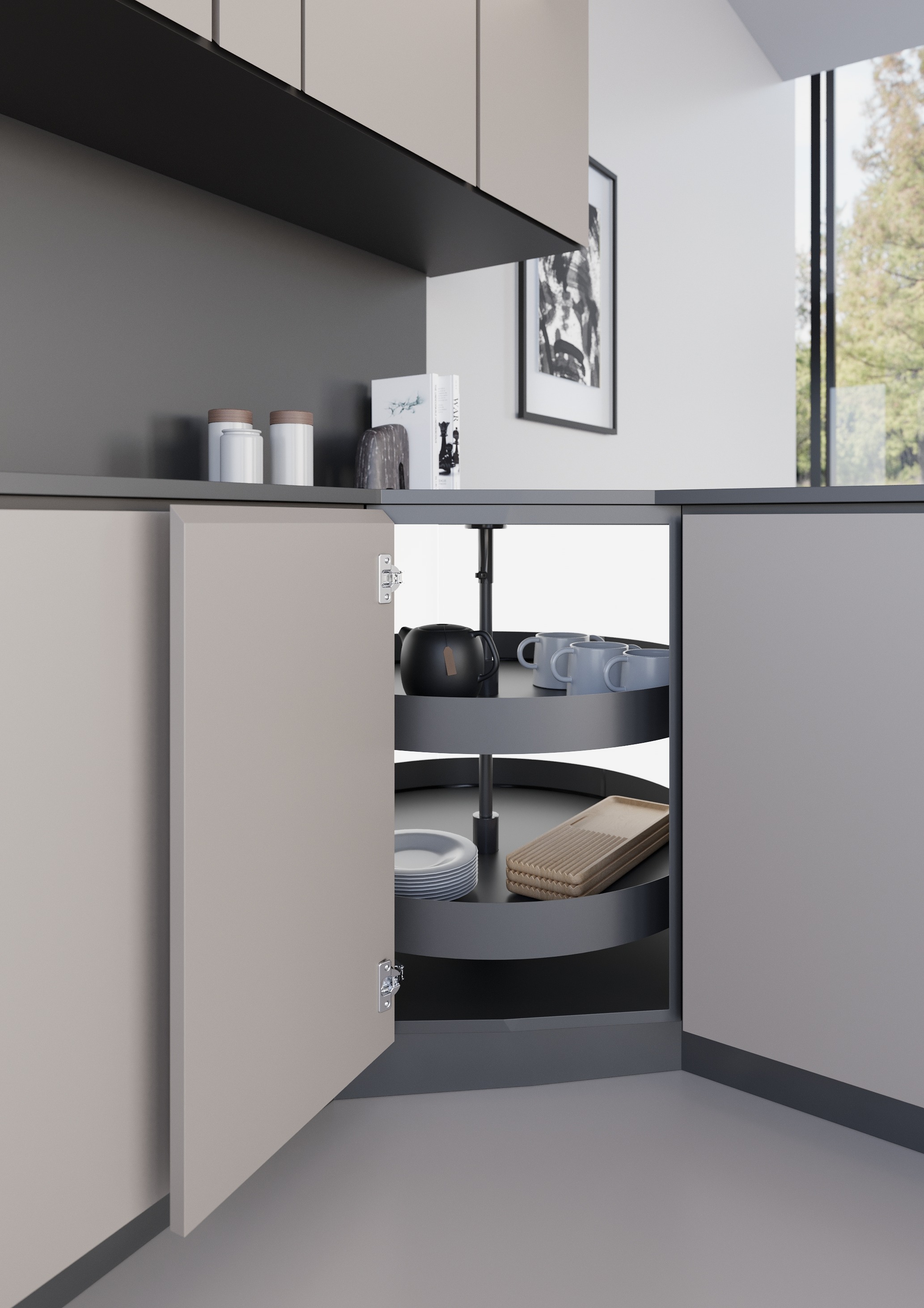 Grazie ai suoi ripiani rotanti indipendenti, consente di accedere facilmente a tutto il contenuto del mobile senza necessità di estrazione: è sufficiente una semplice rotazione per avere tutto a portata di mano, con una visione chiara e ordinata degli oggetti riposti.