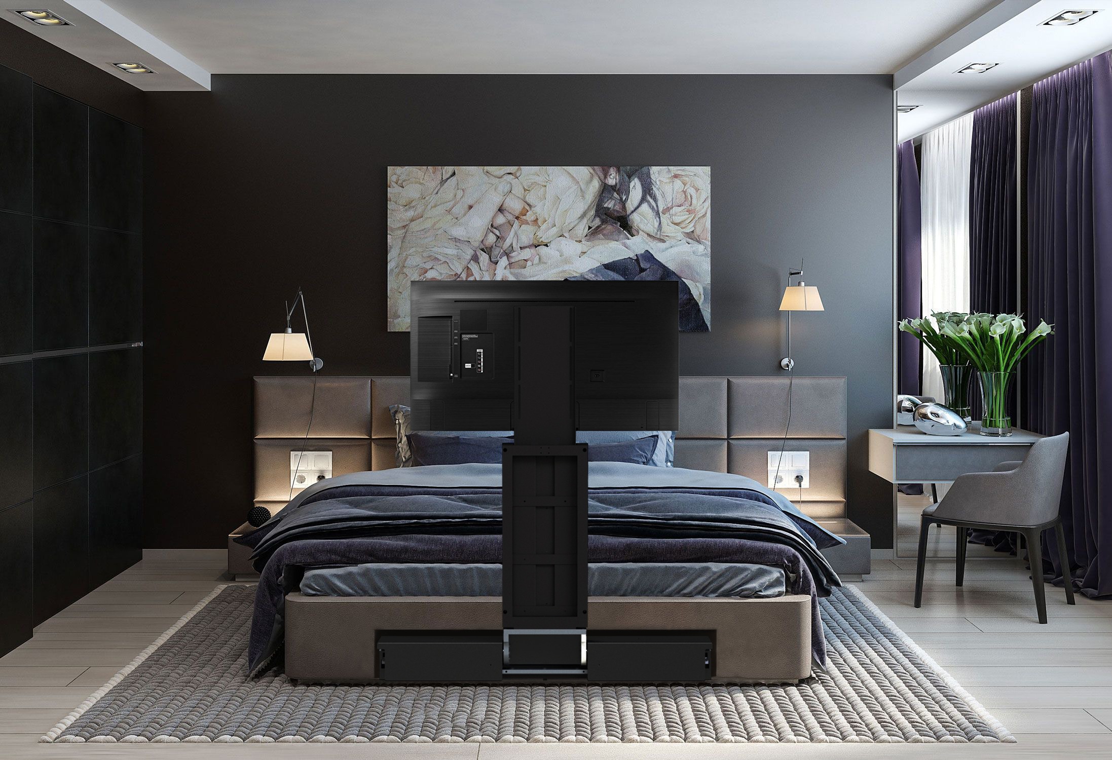 Il nostro sistema motorizzato under bed consente di nascondere la TV sotto il letto quando non è necessaria, mantenendo l’ambiente libero e senza ostruire la vista dal letto. Quando richiesto, con un movimento fluido, il meccanismo che contiene la TV esce da sotto il letto, ruota e raggiunge la