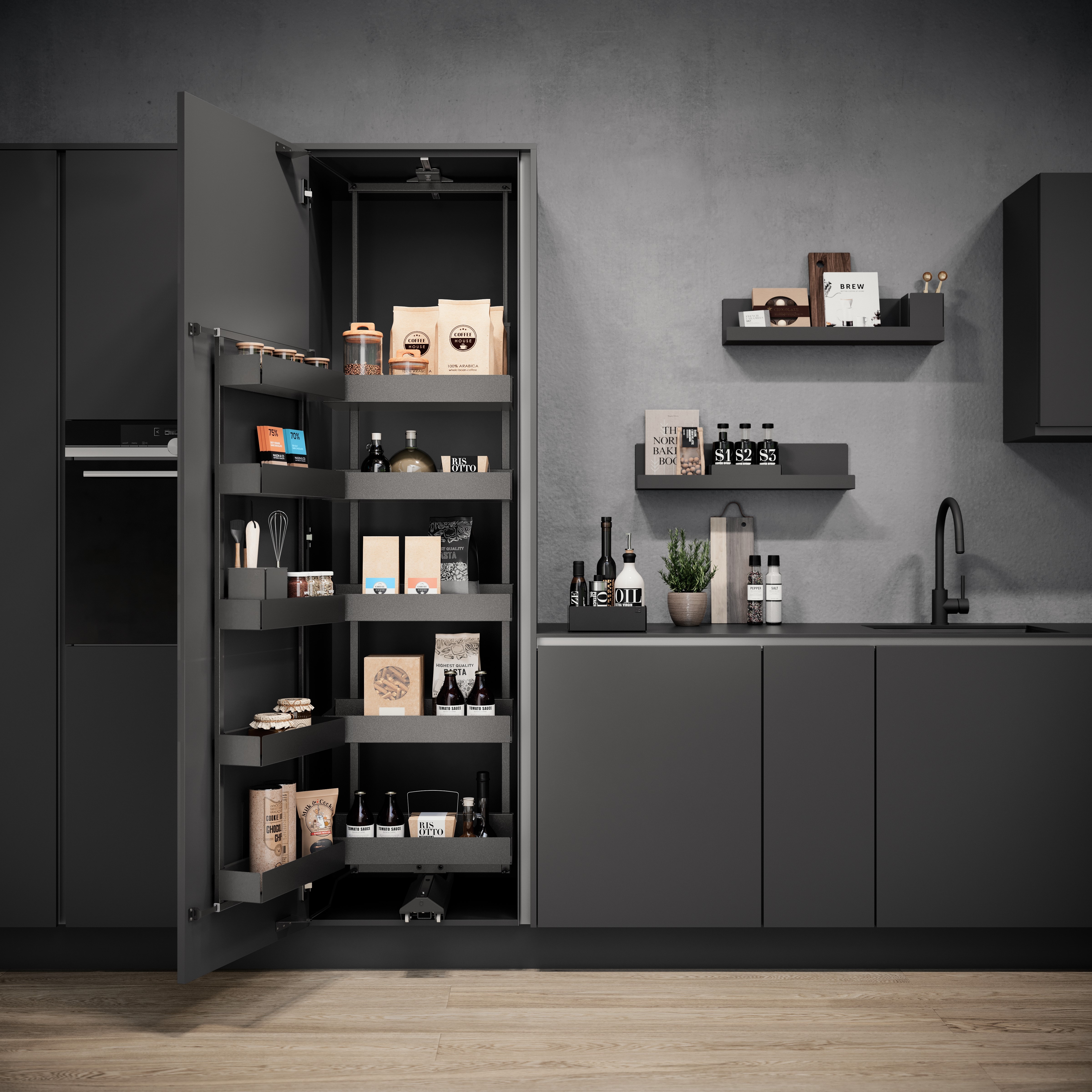 In una cucina moderna gli elementi estraibili portavivande sono diventati irrinunciabili. Oltre ad offrire ampi spazi contenitivi, il sistema soddisfa tutti i requisiti di una pratica soluzione salvaspazio, fino alla soluzione Chef-Pantry, in cui due mobili portavivande sono disposti affiancati con