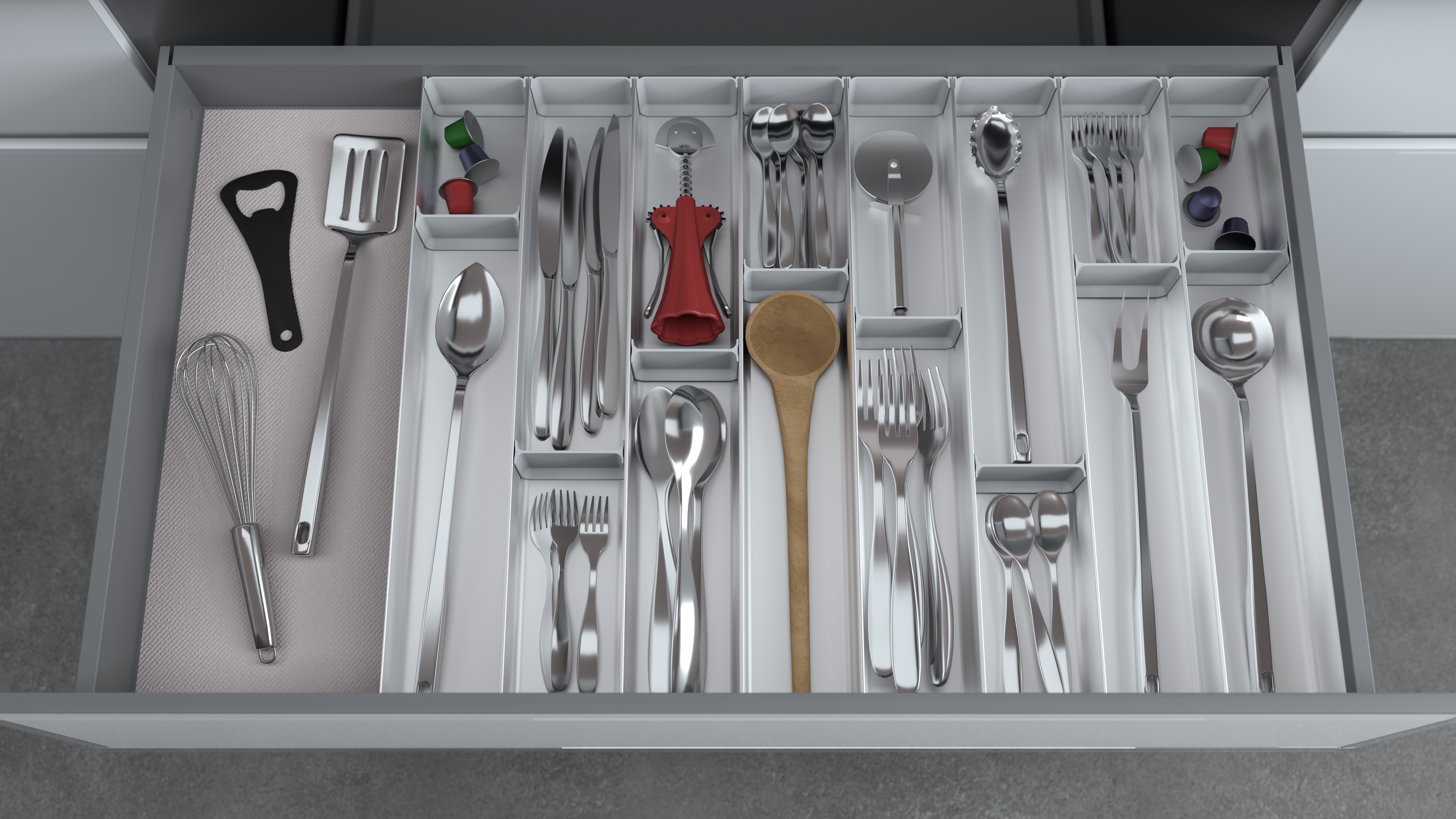 Euro Orvel propone un sistema divisorio cassetti in alluminio composto da due profili, doppio canale e vasca singola, tagliabili a misura secondo necessità, gusto ed esigenze. Articolato con tappi in plastica e divisori posizionabili a piacimento, grazie all’ innovativo sistema ad incastro che u