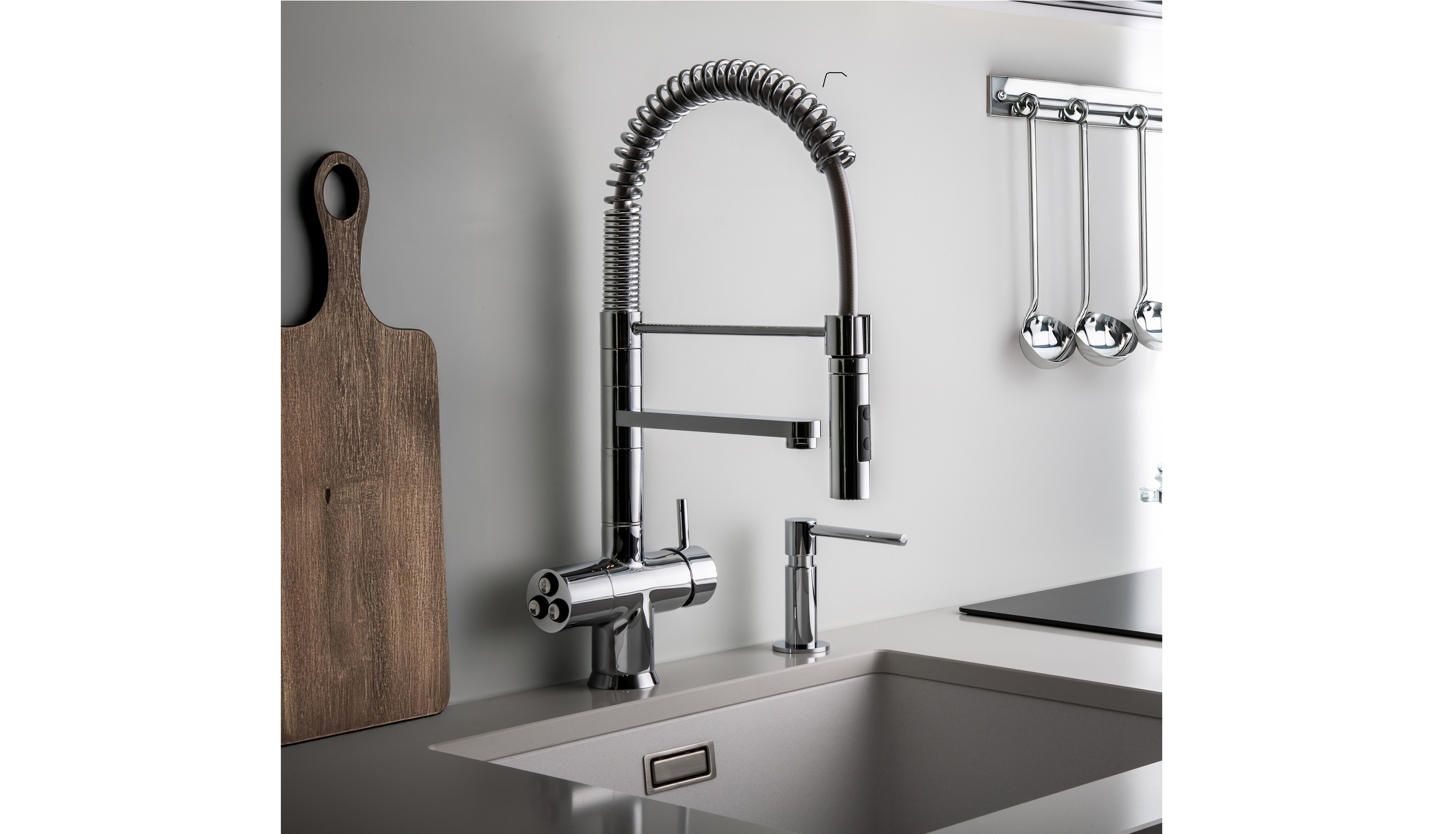Miscelatore a 5 vie elettronico con mollone (altezza 48 cm) e doccetta a due getti, accessoriato con dosasapone da incasso. Personalizzabile per colore e finitura. https://www.gmrubinetterie.it/index.php/prodotti/cucina/miscelatori-cinque-vie/5680-183-291-293-294-295-296-detail