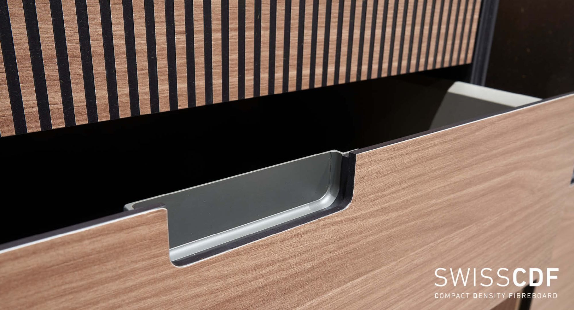 CDF è l’acronimo di Compact Density Fibreboard e indica il pannello di fibre di legno compatto (> 1.000 kg/m3) che conferisce ai mobili un’enorme stabilità. Grazie alla struttura a più fogli, SWISSCDF è particolarmente adatto alla produzione di elementi fresati sottili e decorati con disegni