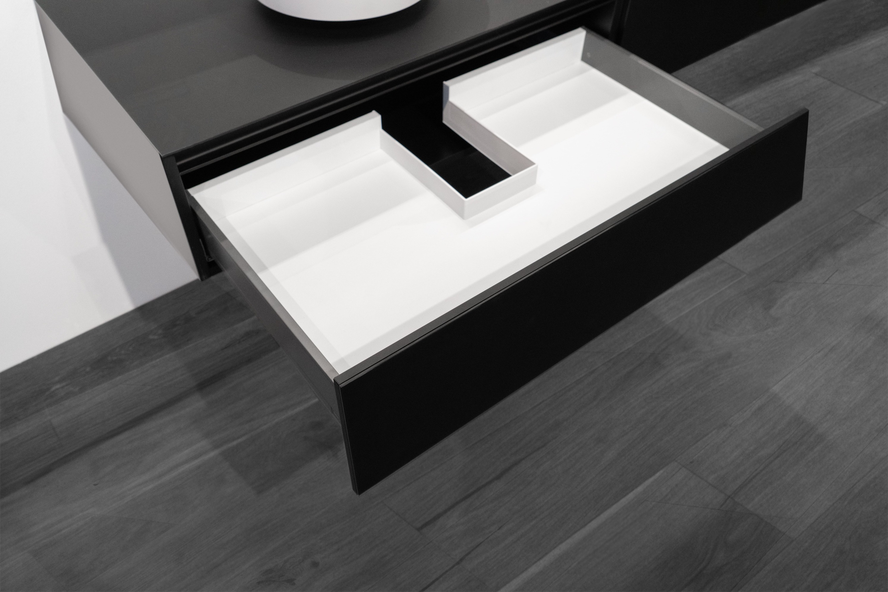 Parete per lo spazio sifone in materiale termoplastico. Pezzo unico. Colore: bianco, grigio chiaro e grigio antracite.
