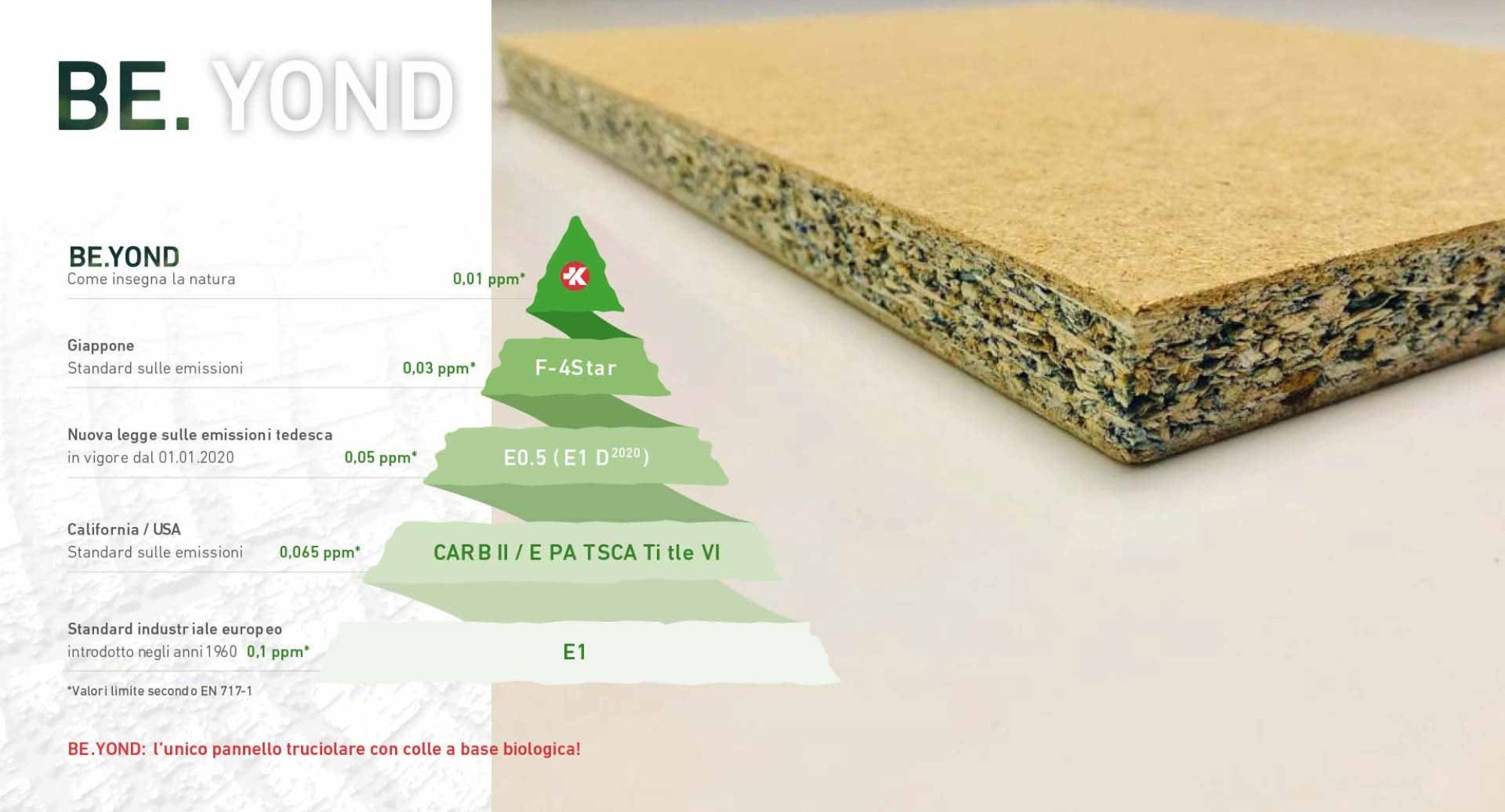 BE.YOND è sinonimo di pannelli truciolari ecologici. Sono realizzati con adesivi di nuova generazione a base biologica e sono composti per almeno il 98% da materiali naturali. Ciò significa che non solo sono i pannelli truciolari più sani sul mercato, ma soddisfano anche i requisiti più elevati